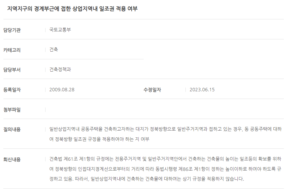 ▷상업지역내 공동주택을 건설하고자 할때 대지의 정북방향으로 일반주거지역이 접한경우 정북방향 일조를 적용하지 않아도 된다.