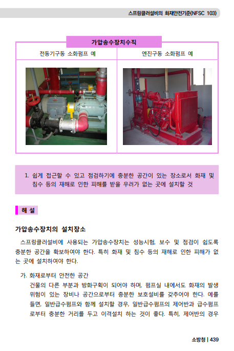스프링클러설비의 화재안전기준(NFSC 103) 제5조(가압수송장치) 1항 1.쉽게 접근할 수 있고 점검하기에 충분한 공간이 있는 장소로서 화재 및 침수 등의 재해로 인한 피해를 받을 우려가 없는 곳에 설치할 것 이라 되어 있다.